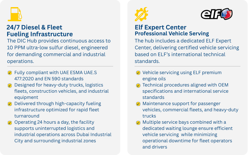 Strategically located within Dubai Industrial City, one of the UAE’s largest manufacturing and logistics corridors, the facility supports companies that require reliable energy access, fleet efficiency, and uninterrupted operational continuity.