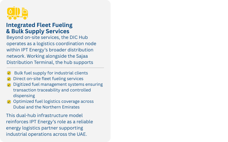 Operationally connected to IPT Energy’s Sajaa Distribution Terminal in Sharjah, the DIC Hub strengthens IPT Energy’s logistics network across the UAE while expanding high-frequency fleet fueling capacity across Dubai and the Northern Emirates.