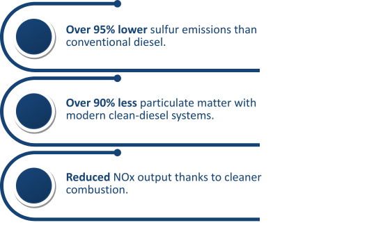 Ultra-low sulfur diesel (ULSD) contains just 10 parts per million (PPM) of sulfur, compared to thousands of PPM in conventional diesel. This small number makes a big difference.